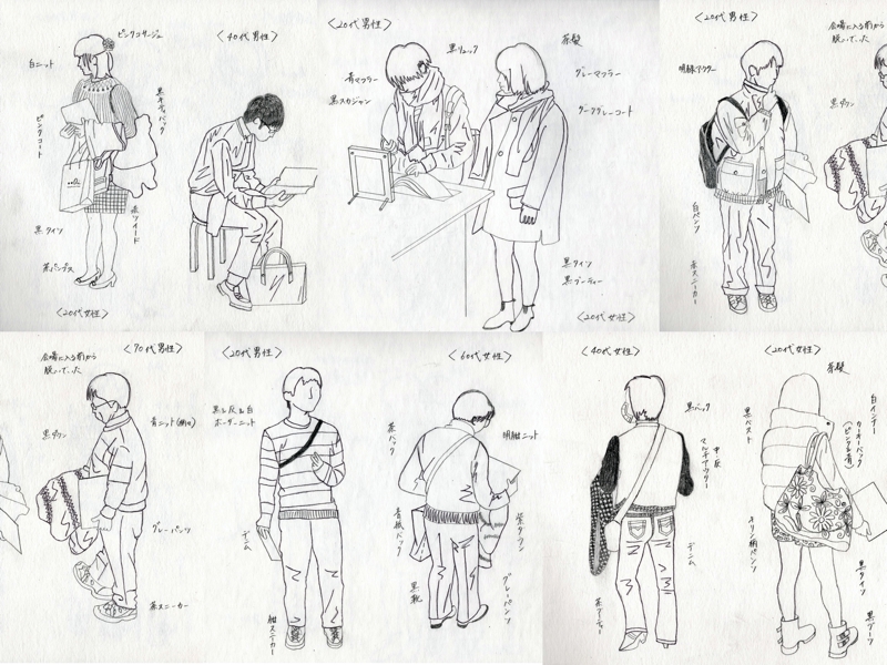 最後に、このスケッチをして気づいたこと。人が作品にたいしてどのような距離感や姿勢をとっているのかが、はっきりと分かった。同じ姿勢の絵が多く見られるのである。この姿勢はなにによって決定されるのか。私は作品がそうさせているように感じた。この作品にはこのポーズといったテンプレートを感じ取り、皆がその姿勢をとるのだ。机にあたらないように腕を組覗き込む、壁に近づきすぎず遠すぎずの距離感で歩く、椅子に座る時の荷物の置き方、見れば見るほど面白いなと感じた。今回「じゅじゅじゅ」という場をフィールドワークして、スケッチを通して“ファッション”からみる人を採集でき、気づきがたくさん得られた。やはり人を見るには、衣食住を通して観察することが分かりやすいのだと思う。