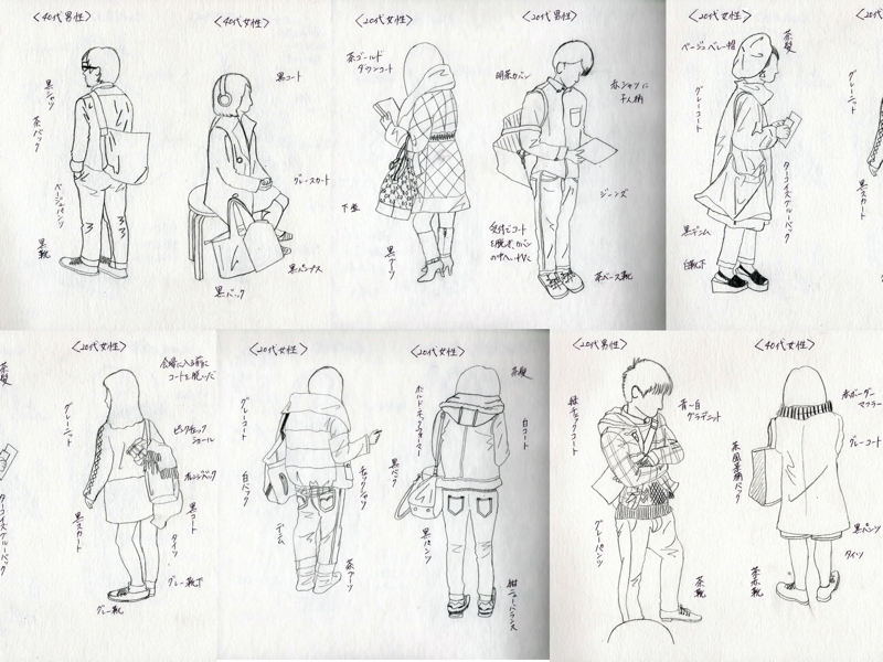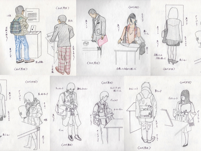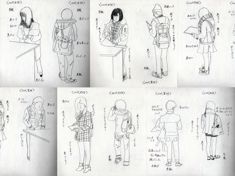 私は今回展示会場に来られた方の“ファッション”に注目し、私なりの採集をした。人は展示会という場をどのように捉え、どのような格好をして来場されるのか。今回の採集で、私は50名のスケッチをした。男性24名女性25名。私が順にみた人で描いたが、来場者の男女比率が同じ位だったのだと実感した。