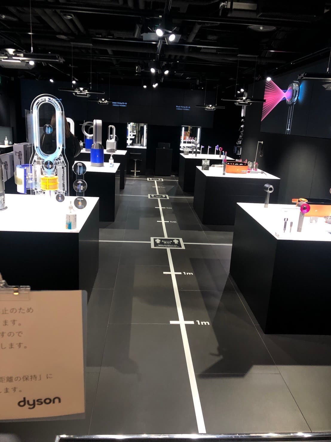 私たちはあらゆる種類の「距離を取らせる仕掛け」を把握するために、藤沢付近に二つ、みなとみらい付近に三つの、計五つの異なる複合商業施設にて再びカメラを手に「仕掛けの採集」を行った。このワークは三日間に渡って実施され、合計五百店舗以上を見て回ることができた。集められた写真を見返す中で、「距離を取らせる仕掛け」は、主に三種類あることに気づいた。一つ目は、建物の入り口やエレベーター付近の壁に貼られた、「できるだけ二メートル以上の距離を取ってください」などと記された貼り紙である。二つ目は椅子やテーブルなどの置き方や配置によって、物理的に立ち入りを不可能にしている仕掛けである。そして三つ目が、入店や会計待ちの列内で「一定の間隔」を空けさせるために、立ち位置を示す目印である床に貼られた足型のロゴやテープである。私たちはこの中でも、店の種類問わず、最も多くみられた三つ目の仕掛けを「足元シール」と呼び、それに着目していくことにした。多くのシールは床面積が足りず、二メートル間隔に置かれていない上、客に無視されており、「形式上の距離」を取らせる仕掛けの代表的なものであると考えた。しかし、足元シール一つとっても、よく見ると店によってデザインはもちろん、配置や、文字情報、受け取られる印象やメッセージもかなり異なり、個性的であることに気づいた。例えば、ダイソン社の黒い店内フロアには、白いテープが定規のメモリのように貼られており、その洗練されたシンプルかつ分かりやすいデザイン性に惹きつけられ感心した。また、アニメグッズを売るショップでは、そのキャラクターの足跡の絵がシールにデザインされており、世界観に入り込みやすく、ワクワク感を覚えた。