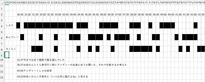 Discordを使っての自由なおしゃべりワークの記録は、データとして見やすいよう、「誰がいつどのような内容のことで話しているか」をタイムラインにまとめた。話し相手や話す内容によって変わる振る舞いや言動についての特徴を探し、グループ内でのメンバー同士の距離感の違いについても見ることにした。その違いは、自分たちの人との距離の取り方を考えることにも何か活かせるのではと考えたためである。