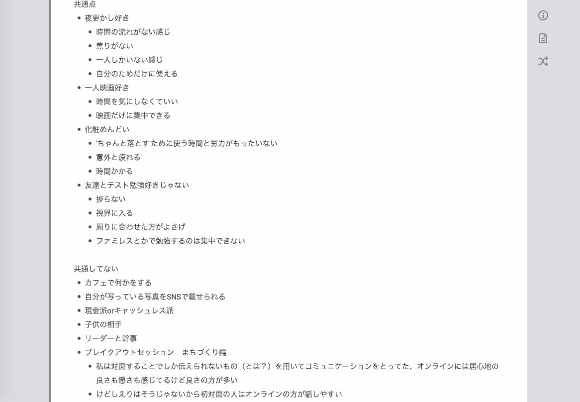 共通点として、夜更かしが好き、化粧を面倒臭く感じる、一人〇〇が好きということなどが挙げられた。相違点の例として、zoomをはじめとするオンラインでのビデオコミュニケーションについてが挙げられた。「ラクではあるけど、対面の方がやりやすい」という意見と「雰囲気が伝わらない分、何も気にすることなく自分の思う通りに発言できて良い」という意見に分かれた。共通点からは、一人での行動をラクに思う傾向が共通して強いことを再認識した。相違点からは、メンバーの中でも人との距離についての考え方は少しずつ違うかもしれないという気づきを得た。