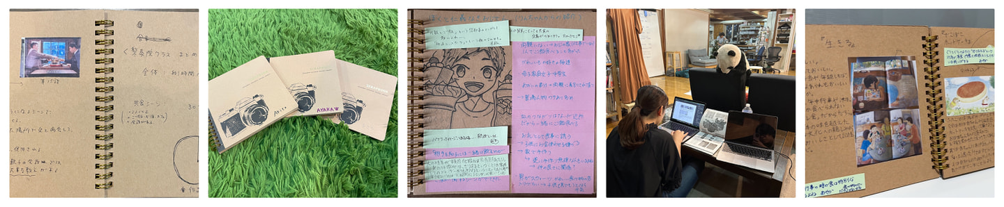 私たちは作品を収集するために100円ショップに売っているクラフトノートを購入し、「スクラップブック」と名付けた。これは、印象的であった食事シーンの写真を貼ったり、登場人物の属性、作者の食のイメージが分かりそうな情景やセリフを書き込んだり、発見があったことを貯蓄していくノートである。スクラップブックには作品を収集する際に、手元に残る形にしたい、みんなで見せ合える形にしたいという想いが込められており、交換することでグループ内外でのコミュニケーションが生まれることを期待した。実際に、スクラップブックの見せ合いはグループ内に留まらずグループ外の人にも広がり、おすすめの作品を教えてもらうといった交流が生まれた。このスクラップブックを3人それぞれが所有、随時更新することに加え、1週間に1度程3人でノートを交換し、その人が収集した作品や食のイメージに対する自分の経験や考えを付箋に書いて貼るようにした。漫画担当の大森は40冊、ドラマ・映画担当の木根はドラマ3本、映画、絵本担当の小泉は12冊分をスクラップブックに記録した。