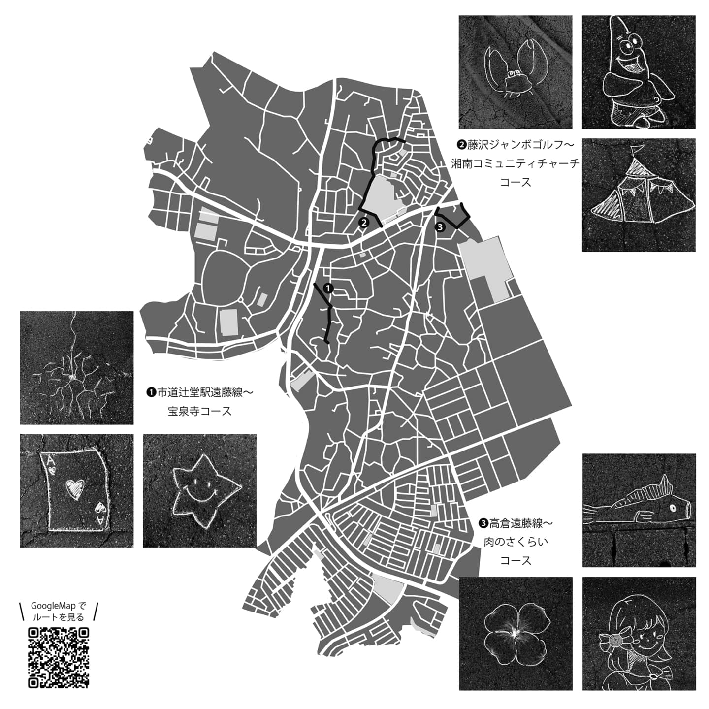 私たちは、ぱっちえんどうの方法としてチョークを用いるのが最適だと考え、他の人にも試してもらうために、いくつかのコースを提案することにした。車通りが比較的少なく安全にお絵描きができること、お絵描きしやすい模様が密集しているという2点を意識して、3つのコースを考えた。コース①は、キャンパスからほど近い市道辻堂駅遠藤線から宝泉寺に向かうルート。コース②は、藤沢ジャンボゴルフから湘南コミュニティチャーチに向かうルート。コース③は、肉のさくらいから秋葉台公園の方をぐるりと回って、高倉遠藤線に再び合流するルートだ。