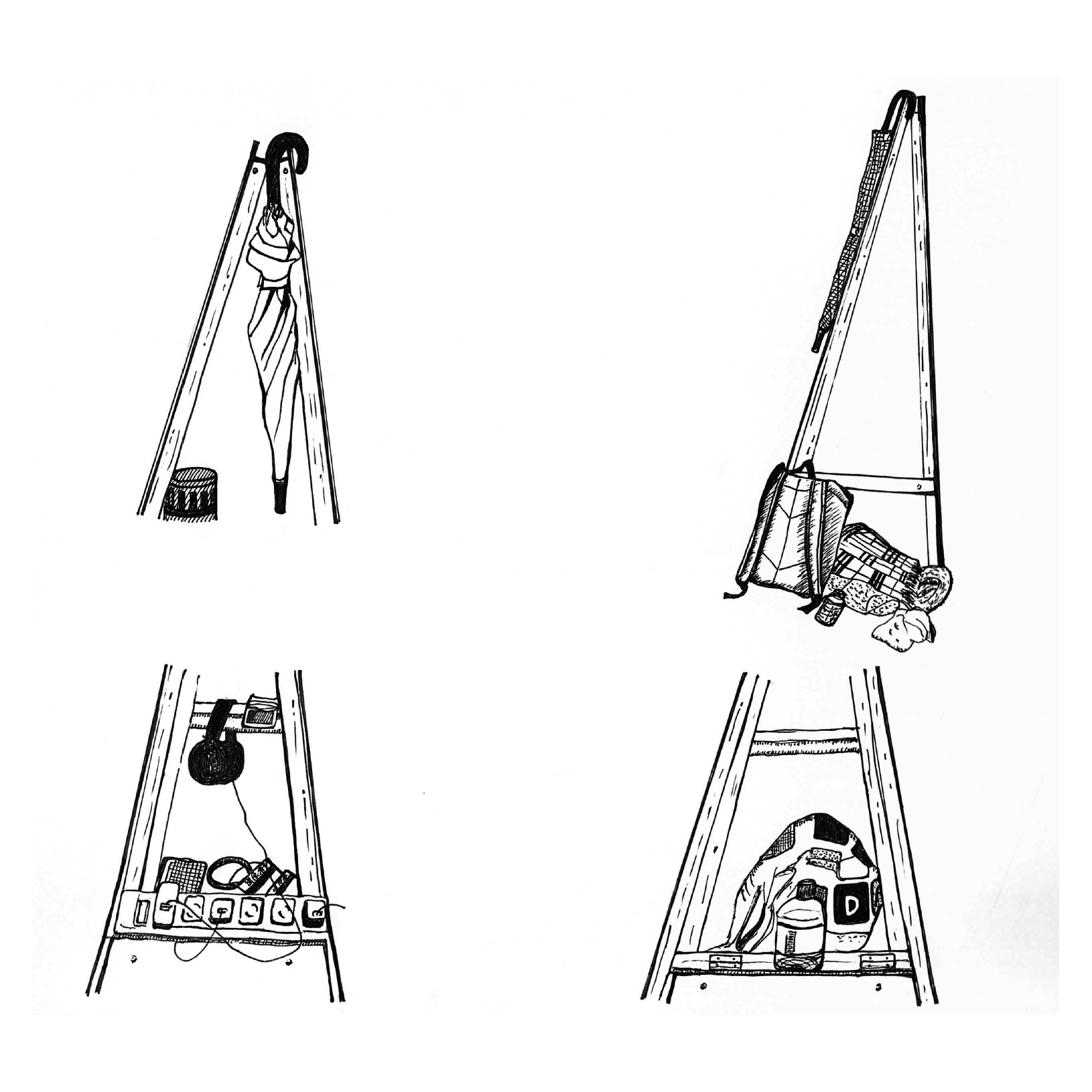 2日目は雨が降っていたため、傘の置き方にも違いが見られた。横に倒しておく、椅子に立てかけるといったことはもちろん、立て看板のくぼみにさしている人や、引っ掛けている人もいた。